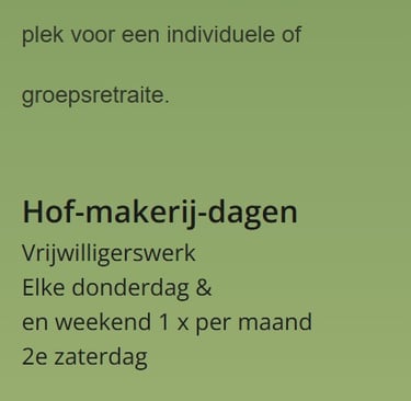 Iedere donderdag, buiten de kerstvakantie natuurlijk, van 9:00 tot 17:00 uur, openen we de deuren van La Cantina voor onze wekelijkse hofmakerij. Dit is een prachtig initiatief waarin we de aarde het hof maken, een idee dat zowel boeiend als vervullend is. Samen met een wisselende groep bewoners, gasten en mee-makers steken we onze handen uit de mouwen om het onderhoud van de gebouwen, de moestuin en het groen op Hof van Moeder Aarde te verzorgen. Het is een geweldige manier om de natuur te eren, en bovendien om nieuwe mensen te ontmoeten!