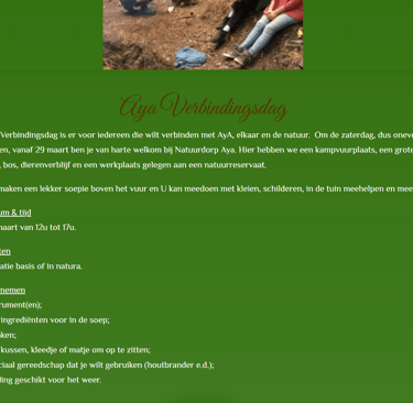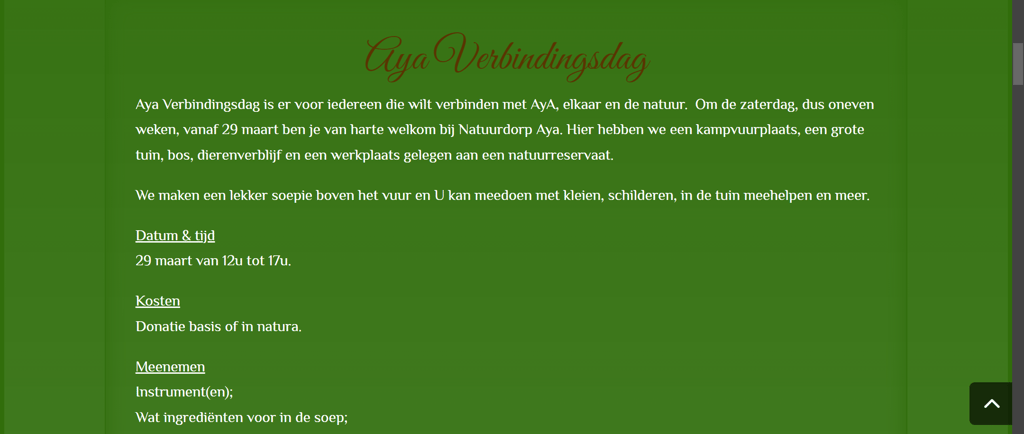 Op elke zaterdag van de oneven weken, beginnend op 29 maart, ben je van harte welkom bij Natuurdorp Aya.