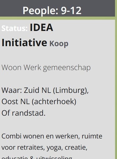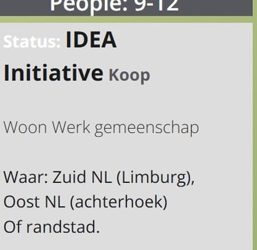 We streven naar gezamenlijk eigendom ('mede-eigendom') van de locatie, die we momenteel nog zoeken. Onze voorkeur gaat uit naar de Achterhoek, Limburg of de Randstad, maar de juiste plek is belangrijker dan de exacte locatie.