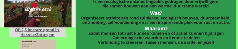 Organiseert activiteiten rond tuinieren, ecologisch bouwen, duurzaamheid, ontmoeting, zelfvoorziening en is een inspirerende plek voor rust en actie.